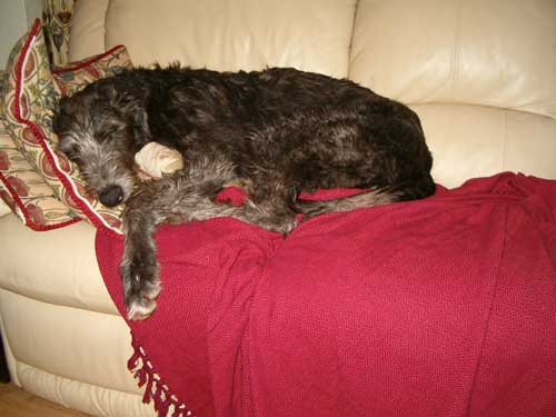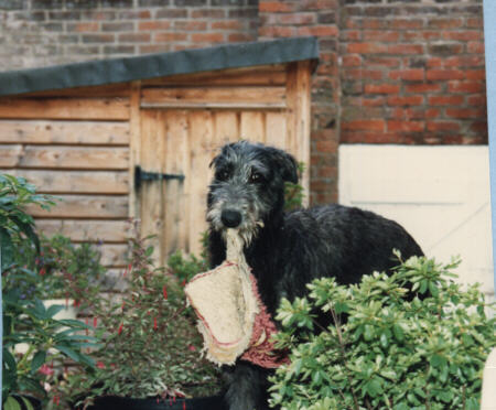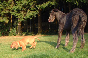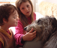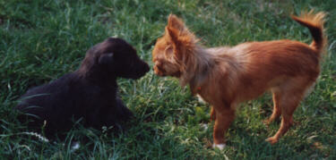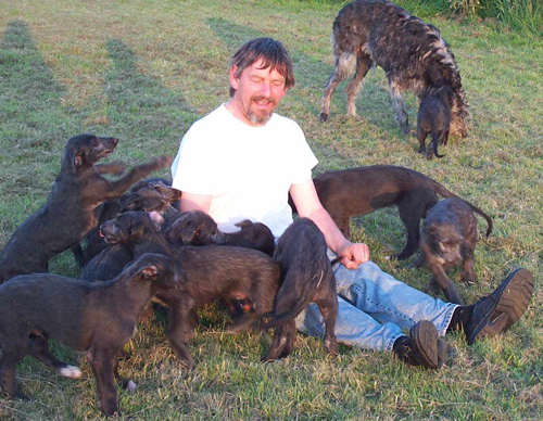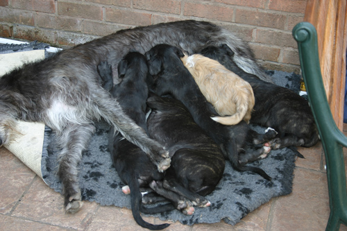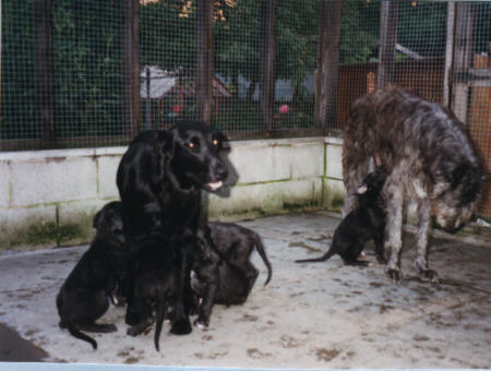 Rayne (flatcoat) helping Kilbourne Velvet out with the feeding of her pups