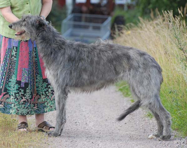 Very attractive deerhound puppy. Lovely expressive head, correct bite. Neat ears, very pleasant top line and for the age sufficient body. Good skeleton, today a little loose paws, good coat quality. Moves really nice with movments typically for the breed. Promising.